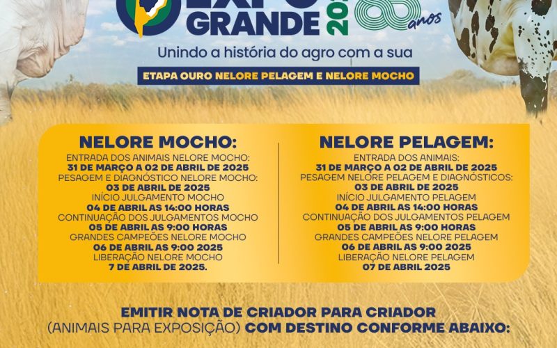 A Expogrande, que acontece entre os dias 31 de março e 7 de abril em Campo Grande (MS), contará com avaliações de animais puros de origem válidas para os rankings nacionais do Nelore Mocho e do Nelore Pelagens, promovidos pela Associação dos Criadores de Nelore do Brasil (ACNB). A exposição é uma das etapas “ouro” da edição 2024/2025 dos rankings das citadas variedades da raça Nelore. Os resultados são válidos também para os Rankings Regionais Nelore Mocho e Nelore Pelagens do Mato Grosso do Sul, promovidos pela ACNB e pela Associação Sul-Mato-Grossense dos Criadores de Nelore (Nelore MS).